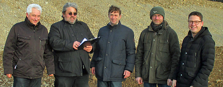 An der Übergabe der Multifunktionsfläche nahmen Erster Beigeordneter Hubert Schmelz, Erwin Kranz vom Amt für Bodenmanagement, Eiterfelds Bürgermeister Hermann-Josef Scheich, der Vorsitzende der Flurbereinigung, Thomas Sondergeld, und Joachim Lohfink von der gleichnamigen Baugesellschaft teil (v.l.n.r.).