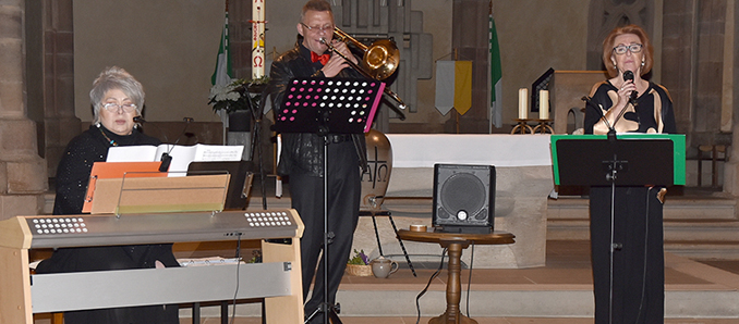 Natürlich wurden auch so Ohrwürmer wie „Edelweiß und Can You Feel The Love Tonight“ dargeboten. Eingeflochten zwischen die Gesangsbeiträge bot das Ehepaar Irina und Victor Basiuk zwei Kompositionen für Klavier und Posaune. Der tonsichere und modulierte Umgang des Posaunisten mit seinem Instrument war ein echter Ohrenschmaus. Ein besonderer Beitrag war die „Kiew-Hymne“, bei der Silvia Völker-Vlasanek erstmals in ukrainischer Sprache sang und mit Klavier und Posaune begleitet wurde. Langanhaltender stehender Applaus war der Lohn für ein ausdrucksstarkes anrührendes Konzert und die Künstler konnten ihren Auftritt erst nach zwei Zugaben, darunter „The Shadow of your Smile“ beenden. Den Werdegang der Sängerin und des ukrainische Künstlerehrpaares sowie die Entstehung des Konzertabends hatte Matthias Weller, Vorsitzender des Vereins Rasdorfer GenussKultur, zu Beginn ausführlich geschildert. +++ wim