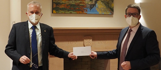 Für die Restaurierung und Herrichtung des Ferdinand-Maximilian-Saals im Wächtersbacher Schloss hat die Stadt Wächtersbach 75.000 Euro aus dem Kreisausgleichsstock des Main-Kinzig-Kreises erhalten. Landrat Thorsten Stolz übergab die Zuwendung an Bürgermeister Andreas Weiher. „Die Sanierung des Wächtersbacher Schlosses ist ein Impulsprojekt, das die Attraktivität der Altstadt steigert. Es regt Investoren dazu an, eigene Projekte im Umfeld des Schlosses zu entwickeln und zu verwirklichen. Mit der bewilligten Summe möchte der Main-Kinzig-Kreis dieses mutige Projekt der Stadtentwicklung und der Denkmalpflege fördern“, sagte der Landrat. Bürgermeister Weiher bedankte sich für die Hilfe des Kreises: „Der Festsaal wird für kulturelle Veranstaltungen genutzt, aber auch für Festlichkeiten wie Hochzeiten oder Familienfeiern sowie für Sitzungen der kommunalen Gremien. Im ehemaligen Herrschaftshaus der Isenburger findet nun neben der Stadtverwaltung auch bürgerschaftliches und gesellschaftliches Leben seinen Platz.“ Nach den Worten des Bürgermeisters belaufen sich die Gesamtkosten für die Sanierung des Schlosses auf rund 13 Millionen Euro.