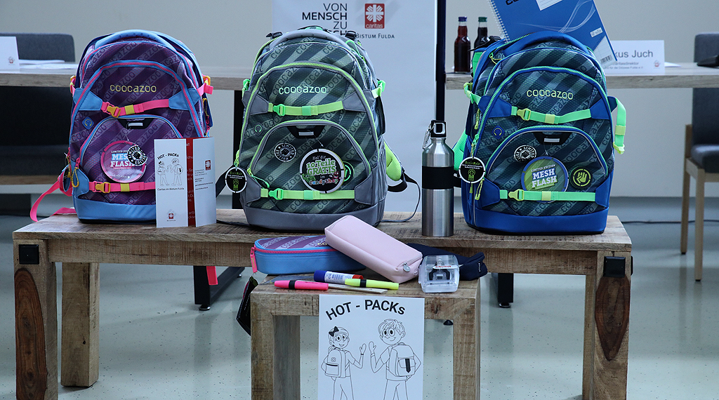 „Die Caritas-HOT-Packs, wobei das ‚HOT‘ in der Mitte für ‚Hundred (and) One Teen-Packs“, also 101 gefüllte Schulrucksäcke steht, sind aus den Überlegungen unserer letzten gemeinsamen Aktion mit dem Caritasverband für die Regionen Fulda und Geisa heraus entstanden“, so Dr. Markus Juch, Diözesan-Caritasdirektor des Caritasverbandes für die Diözese Fulda e.V. zu Beginn der heutigen Pressekonferenz zur Vorstellung der gemeinsamen Aktion im Café „bunt.Werk“ in der Edelzeller Straße 44 in Fulda. „In diesem Zusammenhang haben wir überlegt, wie wir anderen Zielgruppen, die Hilfe bedürfen, unterstützen können. Hier kam uns die Idee, Schulkinder zu unterstützen. Für angehende Fünftklässlerinnen und Fünftklässler beginnt mit der Jahrgangsstufe fünf, mit dem sich oftmals auch ein Schulwechsel vollzieht, ein neuer Lebensabschnitt – und hierfür möchte man gerne auch etwas Neues haben, man kennt das ja“, führt der Caritasdirektor in der Diözese Fulda mit einem Lächeln im Gesicht weiter aus.