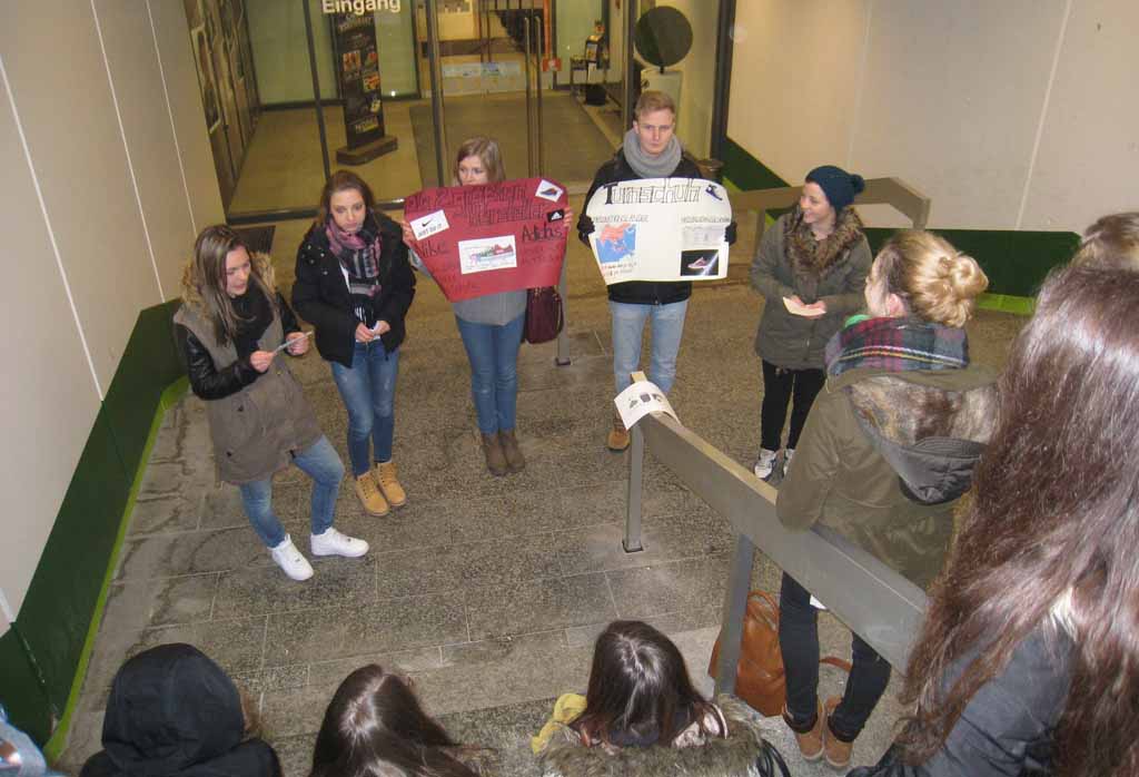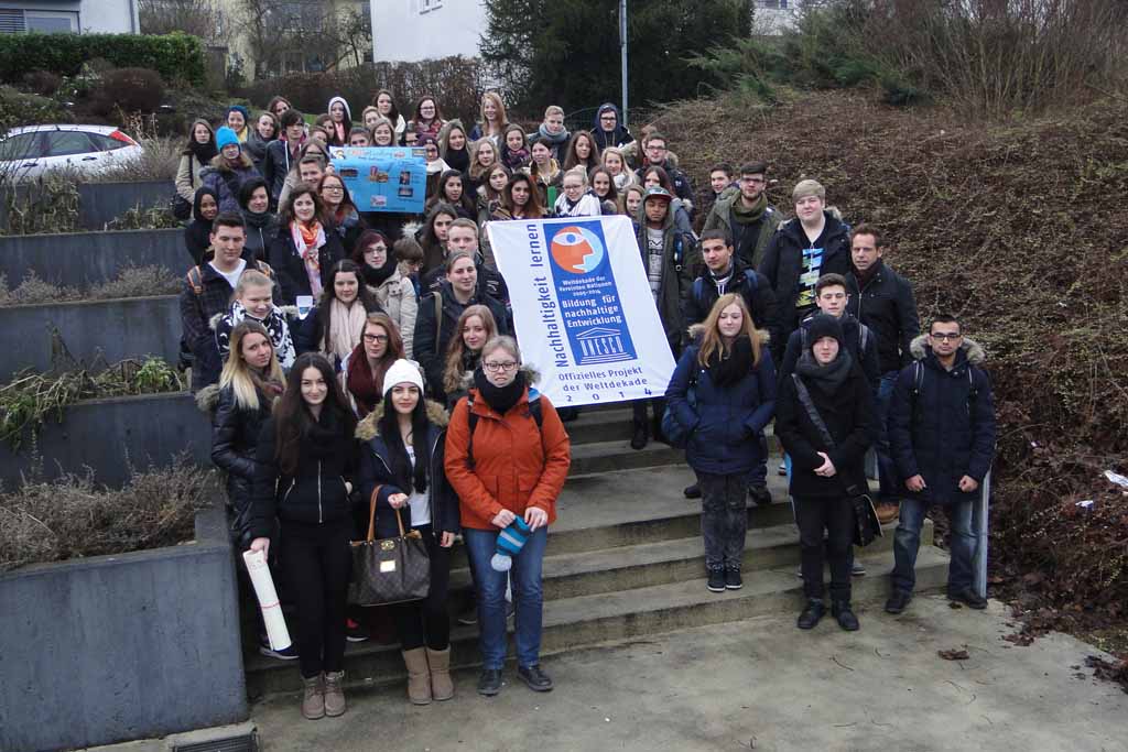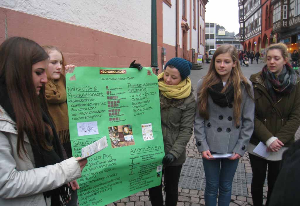 Unter der Leitung von Christian Quanz und Martin Klering präsentierten etwa 70 Schülerinnen und Schüler bei nasskaltem Wetter ihre Ergebnisse in der Fuldaer Innenstadt vor diversen Läden, um so den Bezug ihres eigenen Konsums zu verdeutlichen. Missstände in Menschenrechten, unübersichtliche Zuständigkeiten sowie Korruption in Entwicklungsländern ermöglichen namenhaften Großkonzernen eine günstige Produktion. Von dieser profitieren wiederum wir – in den Industrieländern – durch günstige Preise. Zu den Folgen für einen großen Teil der Bevölkerung zählen Armut, Konflikte um Rohstoffe und Flucht. Aufgeschreckt durch die hohen Todeszahlen in asiatischen Textilfabriken oder die Misshandlung von Kindern bei der Kakaoernte auf afrikanischen Plantagen, zeigten die Schüler ernste Betroffenheit.