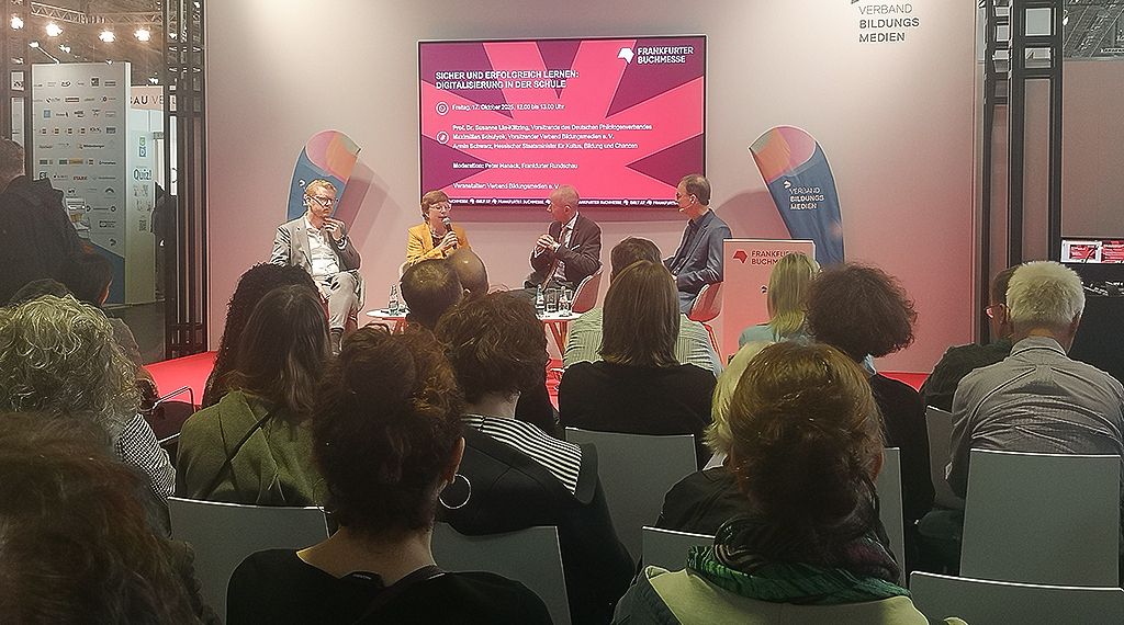 Im Forum Bildung in Halle 3.1. fand zu diesem Themenkomplex eine Diskussionsrunde statt, an der die Vorsitzende des Deutschen Philologenverbands, der Vorsitzende des Verbands Bildungsmedien e.V. sowie der Hessische Kultusminister Armin Schwarz teilnahmen. Grundsätzlich wurde die Digitalisierung in Schulen positiv bewertet, jedoch auch auf bestehende Probleme hingewiesen. So variiere die technische Ausstattung – etwa bei Hardware, WLAN-Verbindungen und Software – stark zwischen den Bundesländern. Auch in Hessen gebe es Defizite, räumte der Kultusminister ein, verwies jedoch auf die Zuständigkeit der Schulträger und betonte, dass ausreichende finanzielle Mittel für die digitale Ausstattung bereitstünden.