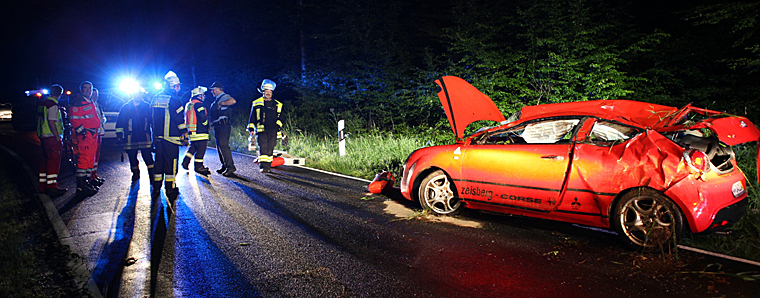 Nach der Entdeckung des stark deformierten Unfallfahrzeugs am Waldrand, wurden Polizei, Notarzt, Rettungsdienst und Feuerwehr alarmiert. „Am Unfallwrack waren Blutspuren, aber vom Fahrer keine Spur“, schilderte Gemeindebrandinspektor Stefan Hahn. Die Einsatzkräfte leuchteten daraufhin die Unfallstelle umfangreich aus, richteten den Unfallwagen auf und durchforsteten das Gelände weiträumig. Mit einer Drehleiter und einer Wärmebildkamera wurde das Gebiet sogar aus der Luft abgesucht. Nach rund einer halben Stunde vergeblicher Suche am Unfallort, konnte die Polizeistation Alsfeld den Aufenthaltsort des Verletzten ermitteln und die Rettungskräfte abrücken. Im Einsatz waren rund zwanzig Feuerwehrleute mit fünf Fahrzeugen der Nieder-Ohmener Feuerwache, ein Rettungsteam der DRK-Wache aus Nieder-Ohmen, das Notarzteinsatzfahrzeug der Johanniter-Unfall-Hilfe aus Grünberg sowie zwei Streifen der Polizeistation Alsfeld. +++ fuldainfo