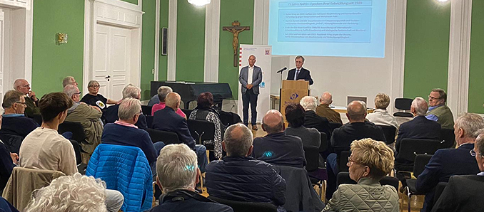 Generalleutnant a.D. Heinrich Brauß, ehemaliger Beigeordneter Generalsekretär der NATO, führte die knapp 60 Teilnehmer durch die verschiedenen Epochen des Bündnisses, von seiner Gründung im Kalten Krieg bis hin zur heutigen Zeit, geprägt vom russischen Angriffskrieg gegen die Ukraine.