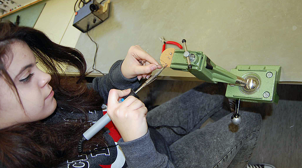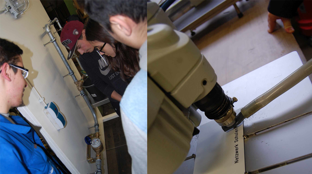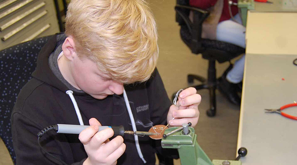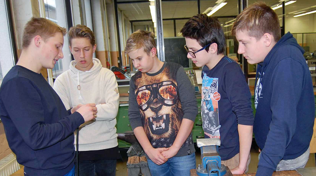 Zusammen mit einigen Auszubildenden erläuterte Werkstattleiter Wolfgang Schütz den Jugendlichen die ausgewählten gewerblichen Berufsbilder Anlagemechaniker Rohrsystemtechnik, Anlagenmechaniker für Sanitär-, Heizungs- und Klimatechnik, Elektroniker für Betriebstechnik und Fachangestellter für Bäderbetriebe. In kleinen Workshops durften die Schülerinnen und Schüler anschließend selbst Hand anlegen und ausprobieren, wie man in der Rohrsystemtechnik thermoplastischen Kunststoff schweißt oder in einem Bäderbetrieb den Chlorwert des Wassers bestimmt. Unter der Anleitung von Auszubildenden durften sie in der Metallwerkstatt ihren Namen in kleine Bleche einstanzen, versuchten sich in Grundfertigkeiten wie Anreißen, Körnen und Biegen der Bleche. Ein Auszubildender erklärte, dass man als Anlagenmechaniker alles gut beschriften muss. Weil dafür Papier und Tintenschreiber nicht geeignet sind, werden Schilder graviert. Zur besonderen Freude durften sich alle Jugendlichen ein Motiv aussuchen und gravieren lassen.