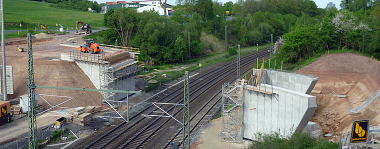 Petersberg/Fulda. Die Arbeiten zur Errichtung der neuen Eisenbahnbrücke zwischen Lehnerz und Götzenhof befinden sich im vorgesehenen Zeitrahmen. Nach Mitteilung von Hessen Mobil sollen am Pfingstwochenende vom 23. bis 25. Mai die Fertigteilträgerder Fahrbahnplatte verlegt werden.