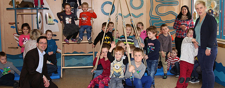 Zur Abrundung wurden die Wände des Raums durch Mitarbeiter des gemeindlichen Bauhofs farblich der Bewegungslandschaft angepasst, so dass sich für die Kinder ein harmonisches Umfeld in Form eines Schiffs auf hoher See bietet. Um die vielfältigen Möglichkeiten des Spiel- und Klettergerätes umfänglich nutzen und gezielt einsetzen zu können, wurden die Erzieherinnen vom Hersteller speziell dafür geschult. Die Investition in Höhe von rund 10.000 Euro für die pädagogisch wertvolle Ergänzung des Kindergartens in Magdlos wurde zu 50 Prozent vom Land Hessen gefördert. Die Bewegungslandschaft ist erweiterbar: So soll künftig der gesamte Bewegungsraum mit weiteren Schienen für die Schaukel ausgestattet werden, so dass er vollständig in die Projekte des Kindergartens eingebunden werden kann. Kinder und Erzieherinnen im Magdlos sind sich einig: „Die neue Bewegungslandschaft ist nicht nur toll durchdacht und sieht schön aus, nein, sie macht auch riesigen Spaß, für den wir uns bedanken wollen!“ +++
