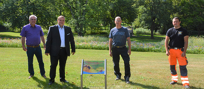 Um die Besucher darauf aufmerksam zu machen, haben Stadtrat Jürgen Bohl, Vorsitzender der Umweltkommission, Bürgermeister Benjamin Tschesnok sowie Marco Koch und Florian Hick vom städtischen Bauhof kleine Schilder aufgestellt, die über diese Blumenwiesen informieren. Artenreiche Blühwiesen seien überlebenswichtige Biotope für eine Vielzahl von Insekten wie die Honig- und Wildbiene, für Hummeln und Schmetterlinge, die damit neue Nahrungshabitate und Lebensräume fänden, betont Tschesnok. Insgesamt wurden mittlerweile fünf Blühflächen im Bürgerpark und rund um den Haselsee angelegt, weitere Flächen sollen folgen. Die nächste Blumenwiese wird beispielsweise an der Nüster Straße in Mackenzell entstehen. Dort soll die Fläche neben der Einmündung auf die Landesstraße mit heimischen Blumen und Blütenpflanzen gestaltet werden.