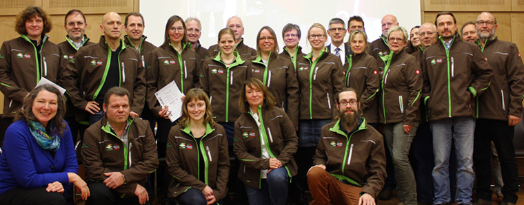 Die neuen „Botschafter der Vulkanregion Vogelsberg“ haben ihre Zertifikate erhalten und bieten ab sofort erlebnisreiche Wanderungen durch die Region an. Vorne links Lehrgangsleiterin Kerstin Sauermann, die im Auftrag der Naturschutzakademie Hessen die Naturparkführer durch die Ausbildung begleitet hat.Für jedes Alter und jeden Geschmack dürften die 22 Neuen etwas im Angebot haben – hier die Namen und Themen der Naturparkführer: