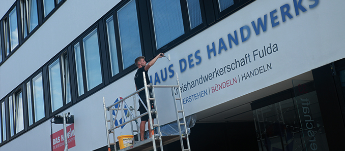 Der blaue Schriftzug „Haus des Handwerks“ sowie darunter im dezenteren dunkelblauen Schriftzug „Kreishandwerkerschaft Fulda“ sowie darunter „Verstehen Bündeln Handeln“ erfolgte über einen neuartigen digitalen Wanddruck. Nur wenige Meter links neben der Fassadenaufschrift findet sich ein weiterer Druck, der für Kreishandwerkerschaften charakteristisch ist. Man kennt und wirbt mit ihm: „Das Handwerk. Die Wirtschaftsmacht. Von nebenan.“ Verantwortlich für die Drucke an der Fassade zeigen sich Sebastian Ruschke und sein Team von Edle Räume Fulda/Hünfeld, ein seit 1986 bestehendes Familienunternehmen, das sich einer exklusiven Raumgestaltung in höchster Qualität verschrieben hat. Das Ergebnis kann sich nach mehreren Stunden des digitalen Druckens sehen lassen. Der Eingangsbereich der Kreishandwerkerschaft Fulda erstrahlt pünktlich zum 50-jährigen Jubiläum wahrhaftig in neuem Glanz.