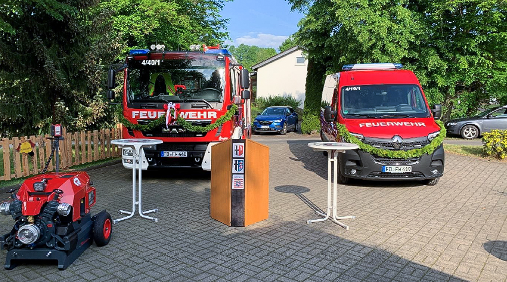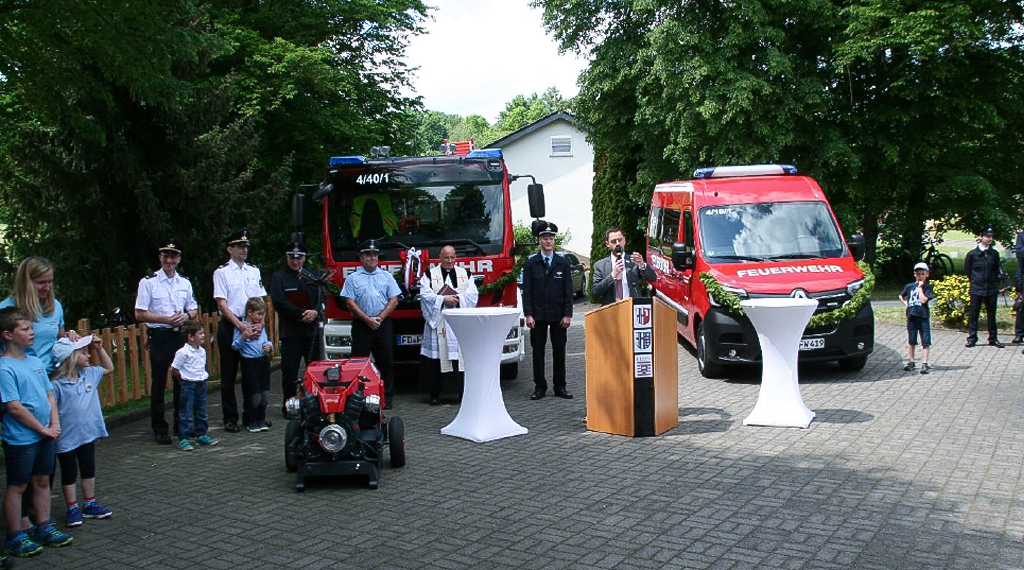 Ein ganz besonderes, einmaliges Ereignis konnte in Kleinlüder gefeiert werden. In einem festlichen Rahmen konnten gleich drei neue Fahrzeuge und Geräte an die Freiwillige Feuerwehr des Ortsteils übergeben werden: Ein Mittleres Löschfahrzeug (MLF), ein Mannschaftstransportwagen (MTW) und eine Tragkraftspritze (TS). Die Einweihung fand am Sonntag, dem 22. Mai 2022, am und im Feuerwehrhaus Kleinlüder statt. Bürgermeister Florian Fritzsch konnte bei bestem Wetter die Einsatzkräfte der Feuerwehren aus der Großgemeinde Großenlüder sowie die befreundeten Wehren aus Bad Salzschlirf und Hosenfeld begrüßen. Als Ehrengäste wurden die Gemeindebrandinspektoren Jürgen Reinhardt und Christian Bosold, Kreisbrandinspektor Adrian Vogler, Kreisbrandmeister Andreas Waldmann, Bernward Münker-Breidung für den Kreisfeuerwehrverband sowie Landtagsabgeordneter Thomas Hering und Vertreterinnen/Vertreter der gemeindlichen Gremien willkommen geheißen. Bereits vor dem offiziellen Teil hatte Landrat Bernd Woide der Veranstaltung eine kurze Stippvisite abgestattet. Zur Segnung der Fahrzeuge wie auch der Tragkraftspritze waren auch viele Bürgerinnen und Bürger aus Kleinlüder und Umgebung zum Feuerwehrhaus gekommen.