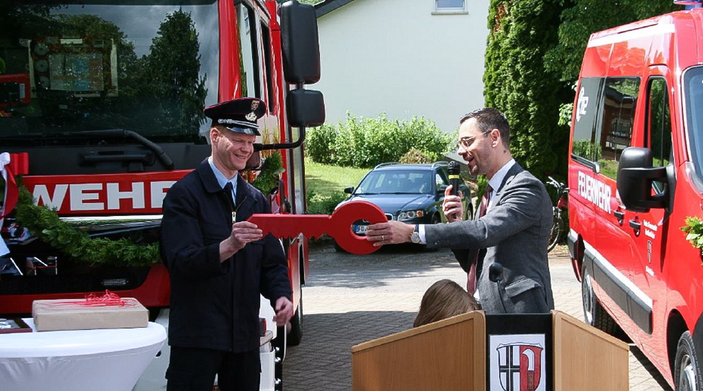 In seiner Begrüßungsrede ging Bürgermeister Florian Fritzsch zunächst auf die Initialen der Freiwilligen Feuerwehr ein, also dem doppelten „F“, und verwies auf die anderen, viel tieferen Bedeutungen, nämlich auf die Worte „finissimo“ für sehr gut und allerfeinsten und „fortissimo“ für sehr stark und sehr laut. An die Kameradinnen und Kameraden der Einsatzabteilung gerichtet führte er dabei aus: „Das `FF´ steht für dreierlei: für beste Qualität in jeder Hinsicht, für Lautstärke zur richtigen Zeit und für Sicherheit am richtigen Ort. Kurz gesagt: 'FF' steht für die Freiwillige Feuerwehr – sowohl hier in Kleinlüder, aber selbstverständlich auch für alle Orts-teilwehren unserer Großgemeinde und in der Nachbarschaft.“ Um zügig, wirkungsvoll und zeitgemäß Hilfe leisten zu können, braucht es natürlich auch eine moderne und am aktuellen technischen Entwicklungsstand orientierte Ausrüstung. Mit dem Mittleren Löschfahrzeug, auf dem die Tragkraftspritze verbaut ist, und dem neuen Mannschaftstransportwagen ist die Ortsteilwehr von Kleinlüder nunmehr bestens ausgestattet. Stell-vertretend für die Bürgerinnen und Bürger von Kleinlüder, die im Einsatzfall auf die Hilfe der Freiwilligen Feuerwehr angewiesen sind, übergibt Bürgermeister Fritzsch das Mittlere Löschfahrzeug und die Tragkraftspritze an die Kameradinnen und Kameraden der Freiwilligen Feuerwehr Kleinlüder. „Mir ist dabei vollkommen bewusst, dass auch ein neues Fahrzeug ohne die, die es bedienen und damit umgehen können, nichts wert ist. Daher freue ich mich über die gute Konstitution der Einsatzabteilung unter der Führung des Wehrführers Michael von Keitz.“