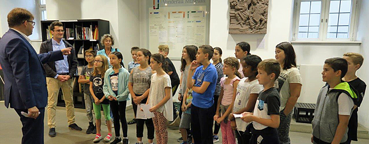 Am Museumseingang waren die jungen Forscherinnen und Forscher zusammen mit ihrer Lehrerin Beate Burde und dem Sachkundelehrer und Schulleiter Klaus Niesel von Museumsleitern Dr. Sabine Fechter und Museumspädagogin Kornelia Wagner gemeinsam mit OB Wingenfeld in Empfang genommen worden. Ein „Forscherkoffer“ zog die jungen Gäste sofort in seinen Bann, und in der Naturkunde-Abteilung des Museums waren auch die neuen Hands-On-Stationen im Nu von Kindern umlagert.