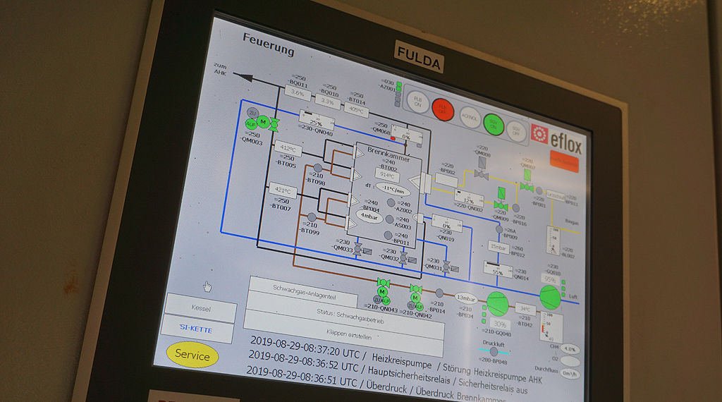 [dropshadowbox align="right" effect="raised" width="40%" height="" background_color="#dce7eb" border_width="1" border_color="#020202" outside_shadow="false" ]Über die Anlage: Die innovative Bio-Erdgas-Anlage bei Kleinlüder erzeugt aus biogenen Reststoffen zunächst Biogas, das dann an Ort und Stelle zu Bio-Erdgas veredelt und ins Erdgas-Netz eingespeist wird. In ihrer verfahrenstechnischen Tiefe und Breite ist diese Anlage in Deutschland einmalig und gilt als Leuchtturmprojekt, das in vorbildlicher Weise die Aspekte Abfallverwertung (Recycling) und Erzeugung regenerativer Energie kombiniert – und das ganz ohne nachwachsende Rohstoffe, sondern allein mit dem Einsatz von organischem Abfall. [/dropshadowbox]Biogas entsteht durch Fermentation des eingesetzten organischen Materials. Im Fall der Biothan handelt es sich dabei im Wesentlichen um Lebensmittelabfälle, die Inhalte der braunen Tonne sowie Gülle. Milliarden von Mikroben zersetzen das Material. Dabei entsteht Gas, das anschließend in einem aufwendigen Verfahren zu Bio-Erdgas veredelt wird. Die Mikroben brauchen ein Milieu von 37- bis 38 Grad Celsius. Die benötigte Wärme ist auf dem Finkenberg bislang mit einer Holzhackschnitzel-Anlage erzeugt worden. Das wertvolle eigene Produkt, Bio-Erdgas, ist nach Auffassung der Geschäftsführung für solche Zwecke zu schade.Uwe Sauerwein, Geschäftsführer der Biothan GmbH, erläutert den jetzt beschrittenen neuen Weg: „Bei jeder Biogas-Produktion entsteht prozessbedingt Schwachgas, das üblicherweise wegen seines geringeren Heizwertes abgefackelt wird. Seit langem haben wir bei der Biothan einen Weg gesucht, dieses Schwachgas noch stärker zur Wärmeproduktion nutzen zu können – und jetzt ist es uns gelungen.“ Mit technischer Unterstützung der e-flox GmbH kann nun bei der Wärmeerzeugung in hohem Umfang Schwachgas eingesetzt werden – ein Spezialbrenner macht es möglich. „Dank dieser Innovation verwenden wir zukünftig einen Energieträger, den wir bislang nur bedingt nutzen konnten und brauchen nur noch in geringem Umfang Zusatzbrennstoffe“, erläutert Biothan-Betriebsleiter Christoph Bien.
