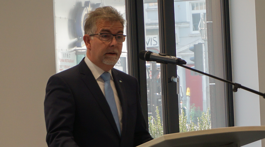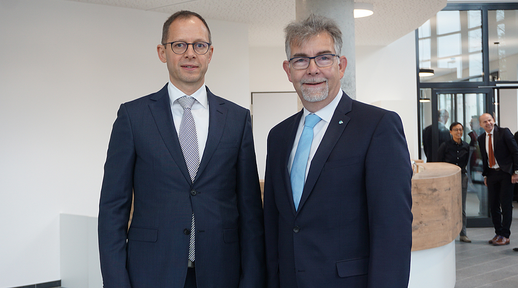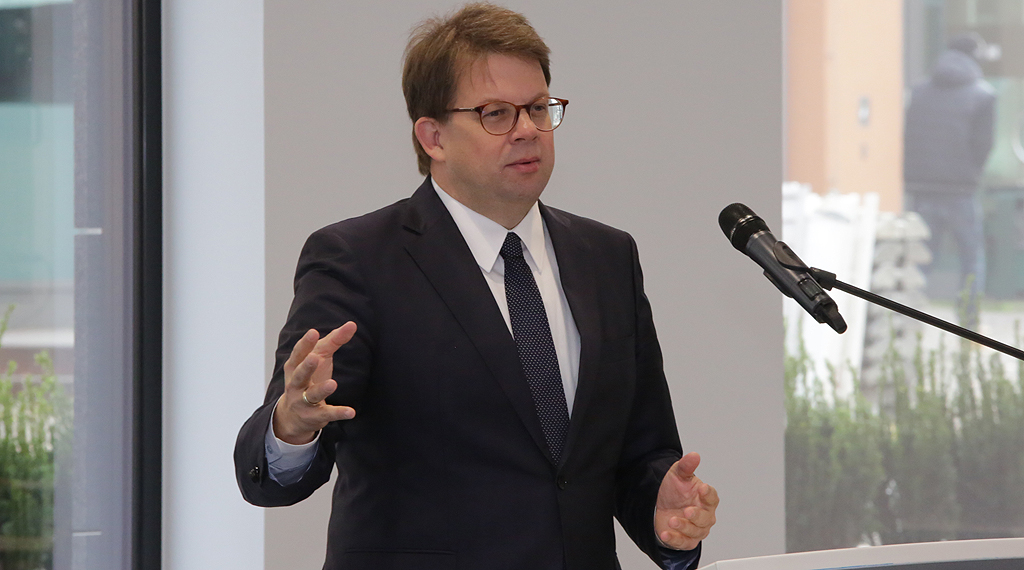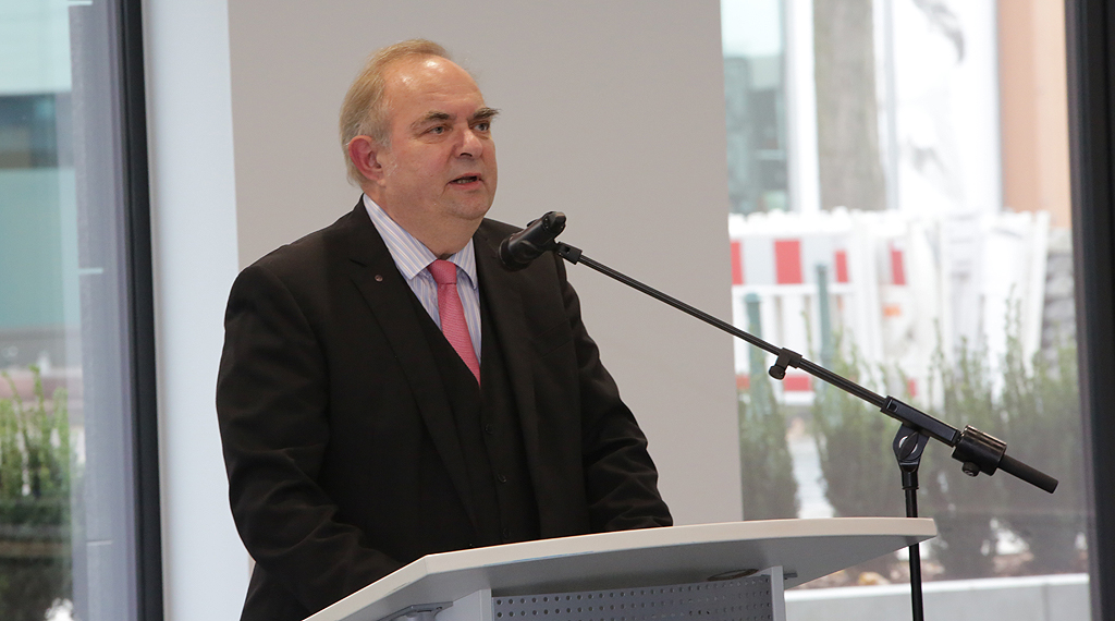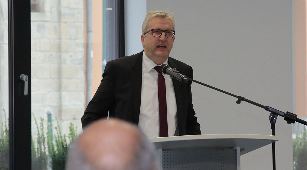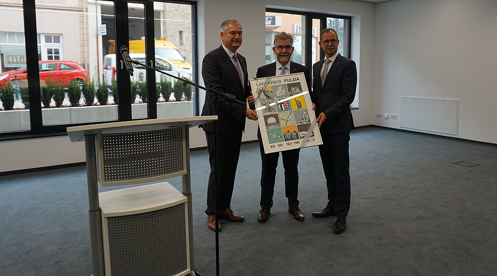 Der Landrat des Landkreises Fulda und Vorsitzende des Aufsichtsrates der RhönEnergie Fulda, Bernd Woide (CDU), überbrachte der RhönEnergie Fulda GmbH die besten Grüße sowie Glückwünsche des Landkreises. „Heute kommt die Bautätigkeit zum Abschluss, darüber sind wir alle froh“, sagte er. Nebenstehend dankte er all denjenigen, die sich für den Bau verantwortlich zeigen. „Ein Bauprozess wie dieser ist kein trivialer Vorgang“, sagte er und dankte allen, die sich in der Vergangenheit für das Gebäude engagiert hatten. In diesem Kontext rief er vergangene Aufsichtsratssitzungen wieder in Erinnerung, als vor der Fusion der Gas- und Wasserversorgung und der ÜWAG zur RhönEnergie Fulda GmbH die Verantwortlichen noch vor der Frage standen, wie man aus zwei Unternehmen ein Unternehmen werden lässt. So etwas, so Woide, könne man beschließen und wünschen, aber eben nicht durchführen. „Und deswegen bin ich der Geschäftsführung der RhönEnergie Fulda dankbar, dass sie bereits sehr früh erkannt und gesagt hat: ‚Wenn man diese Unternehmen in einer langjährigen Tradition – aber natürlich auch mit unterschiedlichen Unternehmenskulturen zusammenführt, dann brauchen wir hierfür auch einen gemeinsamen Platz‘, zitierte Landrat Woide die Geschäftsführung des Ankermieters. „Und das alles stärkt ein Unternehmen und schafft ein Arbeitsklima, indem ein gemeinsames Arbeiten möglich wird und auch zum Erfolg führt“, sagte der Landrat des Landkreises Fulda und Vorsitzender des Aufsichtsrates der RhönEnergie Fulda, Bernd Woide, anlässlich der Einweihung der neuen Zentrale der RhönEnergie Fulda am Mittwoch in Fulda.
