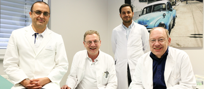 Der Ärtzliche Direktor Jürgen Vey (Bildmitte) freut sich über sein neues Team. Von links: Chefarzt Yousef Muhammad, Assistenzarzt Yaser Alhariri und Anästhesiechef Wolfgang Schmidt. Foto: b&r