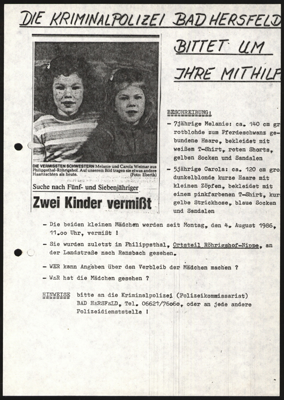 Fulda. Er war einer der spektakulärsten Indizienprozesse in Deutschland: Der Mordfall Monika Weimar. 1988 wurde die gelernte Krankenpflegehelferin aus Röhrigshof-Philippsthal vor dem Landgericht Fulda zu einer lebenslangen Freiheitsstrafe verurteilt. Monika Weimar, damals 28 Jahre alt, soll im August 1986 ihre Töchter Melanie (7) und Karola (5) jeweils erstickt und erwürgt- und an zwei unterschiedlichen Parkplätzen in der Nähe ihres Wohnortes abgelegt haben. Angebliches Motiv: Sie wollte wohl mit ihrem außerehelichen Freund, einem US-Soldaten, ein neues Leben beginnen. Die Kinder hätten ihr dabei sehr wahrscheinlich im Weg gestanden.