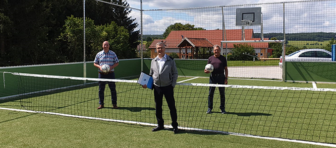 In Oberkalbach ist das DFB-Minispielfeld mit Zuwegung und Parkplatz fertigstellt und eröffnet worden. Der Platz, auf dem neben Fußball auch noch Basketball, Volleyball und Fußballtennis gespielt werden kann, liegt angrenzend oberhalb des Dorfgemeinschaftshauses. Dadurch kann das Feld bei größeren Veranstaltungen mitgenutzt werden. Ein besonderes Highlight auf dem 20 mal 13 Meter größeren Feld, ist die installierte LED-Flutlichtanlage, damit auch am Abend der Platz noch genutzt werden kann. Möglich gemacht hat den Bau neben dem Vorstandsmitglied Hans Dorn, der mithilfe von zahlreichen anderen Mitgliedern der SG Oberkalbach, viele Gespräche führte, Förderanträge stellte und selbst Hand anlegte, vor allem ein früherer Oberkalbacher: Norbert Frischkorn, der vor 50 Jahren nach Nordamerika ausgewandert war und ein größeres Unternehmen für audiovisuelle Medien und Veranstaltungstechnik in Kanada aufgebaut hat. Er spendete einen großen Teil der Maßnahme. Insgesamt kostete das Projekt knapp 134.000 Euro. Finanziert wurde dies über eine Großspende sowie über die Sportförderung des Landkreises, des Landes und der Gemeinde und aus Eigenleistungen des Sportvereins. Bürgermeister Hölzer lobte das ehrenamtliche Engagement. Mitglieder des Sportvereins pflasterten beispielsweise den benachbarten Parkplatz und die Zuwegung und werden bei der Bepflanzung helfen. Florian Hölzer bedankt sich außerdem bei dem Ortsvorsteher Torsten Ickler, bei den Gemeindemitarbeitern Harald Schmidt, Ewald Döppenschmidt und Fabian Schaub sowie bei allen anderen Leuten die zu diesem Projekt beigetragen haben. Dieser Platz ist eine Aufwertung der gesamten Gemeinde. +++ pm