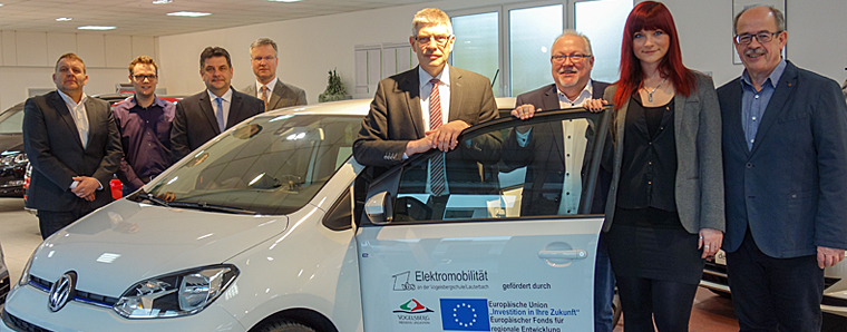 Die Beteiligten bei der Beschaffung des Elektroautos VW e-up! für die Vogelsbergschule bei der offiziellen Fahrzeugübergabe (von links): Reiner Zulauf (Verkaufsleiter), Matthias Röse (Amt für Schulen und Liegenschaften des Vogelsbergkreises), Reinhold Diel, Thomas Jerwin, Landrat Manfred Görig, Schulleiter Holger Arnold, Susan Eichhorn (Deisenroth & Söhne) und Werner Wöll.