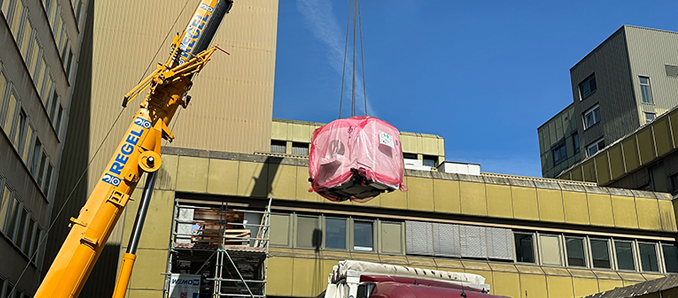 „Wir – das Radiologie Team – freuen uns sehr darauf, mit dem neuen MRT arbeiten zu können. Von der Gerätebedienung über die Bildqualität bis hin zur höheren Patientenzufriedenheit stellt es einen Meilenstein in der radiologischen Diagnostik unseres Hauses dar,“ so Dr. Schmidt. Dazu musste zunächst die Außenwand des Klinikum-Gebäudes geöffnet werden, damit das tonnenschwere Gerät in die 1. Etage der radiologischen Abteilung eingebracht werden konnte. Am Dienstagvormittag konnte daraufhin das neue MRT mittels Kran in das Gebäude des Klinikums gehoben werden.