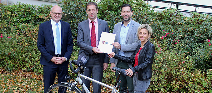 Landrat Dr. Michael Koch (2.v.l.) übergibt Daniel Iliev, Bürgermeister der Stadt Heringen (3.v.l.), den Förderbescheid. Udo Schilling (1.v.l.) vertritt als Erster Kreisbeigeordneter den Wartburgkreis und Bärbel Führer (4.v.l.) als 1. Beigeordnete die Gemeinde Philippsthal.