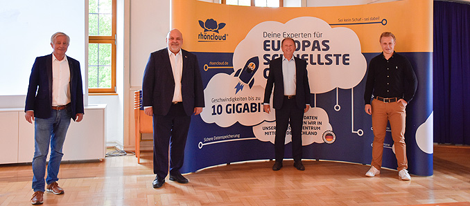 Dieter Kolb, Bürgermeister Eichenzell Markus Meysner, Landtagsabgeordneter Uwe Krabbe, Geschäftsführender Gesellschafter rhönnet GmbH und Manuel Bittorf, Geschäftsführender Gesellschafter rhöncloud GmbH. (v.l.)