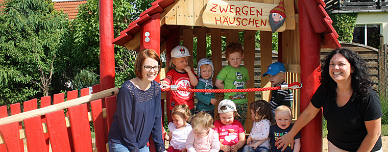 Nachdem 2010 die Einrichtung baulich so erweitert wurde, dass auch unter dreijährige Kinder betreut werden können, blieb kein Geld mehr für die Anschaffung eines Außenspielgeräts übrig. Deshalb begann der Elternbeirat mit verschiedenen Aktionen, vor allem Kuchenverkauf bei Festen, für ein Spielhaus mit Rutsche zu sparen. Die Erzieherinnen suchten verschiedene Modelle aus, von denen schließlich eines, hinsichtlich der zur Verfügung stehenden Sandfläche, sicherheitstechnisch infrage kam.