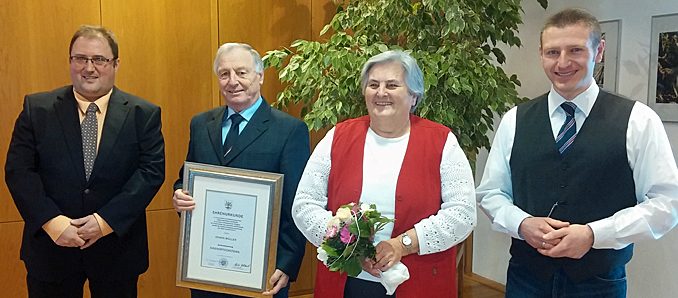 Korell unterstrich, dass bei vielen Aufgaben, die in 2017 und auch in den Folgejahren in Gersfeld noch zu erledigen seien, die Freude, der Enthusiasmus und die Motivation am tun nicht verloren gehen dürfe. „Im Gegenteil, diese Herausforderungen sollen unser Ansporn sein. Es wurde bereits sehr vieles geschafft, aber es gibt noch einiges zu tun, packen wir’s an!“ ermunterte er die Anwesenden. Wesentlicher Bestandteil der Neujahrsbegrüßung war die Ernennung Erwin Müllers zum Ehrenortsvorsteher des Stadtteils Hettenhausen. Steffen Korell würdigte Erwin Müller für seine außerordentlichen Verdienste und sein großes Engagement für das gemeine Wohl und als echten „Motor“, als „Beweger“ und dankte auch seiner Frau Irene und der Familie, die den Geehrten begleiteten. Erwin Müller war über 39 Jahre Ortsvorsteher des Gersfelder Stadtteils Hettenhausen und ist auch heute noch aktives Mitglied des Hettenhauser Ortsbeirates. Darüber hinaus war oder ist Erwin Müller Mitglied in diversen Hettenhäuser und Gersfelder Vereinen aktiv und war lange Jahre Mitglied der Stadtverordnetenversammlung der Stadt Gersfeld (Rhön).
