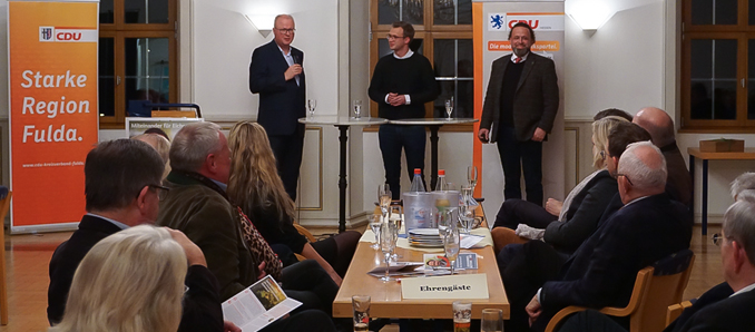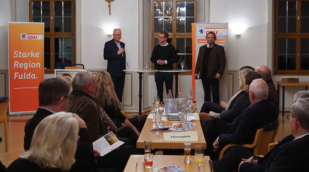 Der Neujahrsempfang der CDU Eichenzell war ein Jahresauftakt nach Maß. Am Freitagabend verweilten rund 120 Gäste in bester Neujahrslaune im Kultursaal des Eichenzeller Schlösschens und verfolgten mit Interesse die eindrucksvolle Rede von Hessens Finanzminister Dr. Thomas Schäfer. Der bekannte Politiker aus Wiesbaden war der erste, der seinem Parteifreund Johannes Rothmund zu seiner Kandidatur beglückwünschte und ihm im Wahlkampf Unterstützung zusicherte. Johannes Rothmund verfügt über ein gutes Netzwerk zu vielen prominenten Politikern und griff gerne auf die Unterstützungszusage von Dr. Thomas Schäfer zurück, den er am Freitagabend freundschaftlich im Eichenzeller Schlösschen willkommen hieß. Joachim Bohl, Vorsitzender des CDU-Gemeindeverbandes Eichenzell und Vorsitzender der CDU-Fraktion im Eichenzeller Gemeindeparlament, begrüßte die zahlreichen Gäste und wünschte ihnen alles erdenklich Gute für das neue Jahr. Neben Staatsminister Dr. Thomas Schäfer konnte Joachim Bohl weitere, prominente Kommunalpolitiker und Persönlichkeiten aus der Region willkommen heißen. So gaben sich CDU-Bundestagsabgeordneter Michael Brand, die ehemalige Landtagsabgeordnete Margarete Ziegler-Raschdorf, der Erste Kreisbeigeordnete des Landkreises Fulda Frederik Schmitt, der Bezirksvorsitzende des CDU Bezirksverbandes Osthessen und Oberbürgermeister der Stadt Fulda Dr. Heiko Wingenfeld, die Bürgermeisterin der Gemeinde Ebersburg Brigitte Kram, die Bürgermeisterin der Gemeinde Nüsttal Marion Frohnapfel sowie der Bürgermeister der Gemeinde Poppenhausen (Wasserkuppe) Manfred Helfrich und der Bürgermeister der Gemeinde Eichenzell Dieter Kolb die Ehre, um gemeinsam mit den Eichenzeller Christdemokraten aufs neue Jahr anzustoßen. CDU-Urgestein Edwin Balzter, Vorsitzender der Eichenzeller Gemeindevertretung, und Julian Rudolf, Vorsitzender der Jungen Union Eichenzell, zeigten sich begeistert über die Anwesenheit der Honoratioren, beide Kommunalpolitiker sorgten für eine gute Betreuung der Gäste.