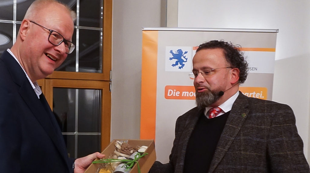 Im Nachgang an die Diskussion bedankte sich Johannes Rothmund bei Finanzminister Dr. Thomas Schäfer mit einem Geschenk (Leckereien aus der Region) und brachte zum Ausdruck, dass er sich über sein Kommen gefreut habe. Der Besuch, so Rothmund, von Finanzminister Schäfer ist auch ein Zeichen dafür, dass das Netzwerk gut funktioniert und ein ‚Miteinander reden‘ sehr wichtig ist.“ Dr. Thomas Schäfer sei für die Region da und er antwortet sehr zügig, wenn man Fragen an ihn hat, so Rothmund. Zum Ende des Neujahrsempfangs lobte Johannes Rothmund die sehr engagierten Mitarbeiter der Gemeindeverwaltung Eichenzell und deren mutige Entscheidungen zum Wohle der Bürgerschaft. „Was wären die Kommunen ohne eine starke Gemeindeverwaltung?“ Lobenswert erwähnte Rothmund auch die bisherigen Leistungen von Bürgermeister Dieter Kolb (parteilos), der des Öfteren mutige Entscheidungen in seiner Amtszeit bewiesen habe. Weiter brachte er zum Ausdruck, dass ihm alle Ortsteile in Eichenzell sehr am Herzen liegen und er sich als Bürgermeister um die Anliegen aller Ortsteile intensiv bemühen möchte.