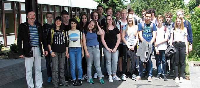 Amöneburger Schulgruppe vor dem Werkstatteingang.