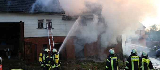 Nieder-Ohmen. In Flammen stand am Freitagmittag ein Wohnhaus mit Scheune im Mücker Gemeindeteil Nieder-Ohmen. Über fünfzig Feuerwehrleute bekämpften den Brand mit mehreren Strahlrohren und einer Drehleiter. Die Ursache für das Feuer ist noch völlig unklar, eine Streife der Polizeistation Alsfeld nahm vor Ort die Ermittlungen auf. Um dem Brand den Garaus zu machen, mussten die Feuerwehrleute mit hydraulischem Gerät eine Tür aufbrechen und im Gebäude unter Atemschutz löschen. Der in Alsfeld stationierte Gerätewagen Atemschutz des Vogelsbergkreises wurde zur Einsatzstelle gerufen, Vize-Kreisbrandinspektor Hubert Helm unterstützte die örtlichen Gemeindebrandinspektoren Stefan Hahn und Bernd Wißner. Der entstandene Sachschaden konnte noch nicht beziffert werden. Die Feuerwehr baute zwei 500 Meter lange Wegstrecken mit Schläuchen zur Ohm auf, um die Löschwasserversorgung sicher zu stellen. Das DRK Mücke war zur Unterstützung der Feuerwehrleute im Einsatz und baute unter anderem ein beheiztes Zelt auf, ein Rettungswagen stand in Bereitstellung. Im Einsatz waren die Feuerwehren Nieder-Ohmen, Flensungen, Merlau, Ruppertenrod, Atzenhain und Alsfeld mit 60 Kräften. +++ fuldainfo