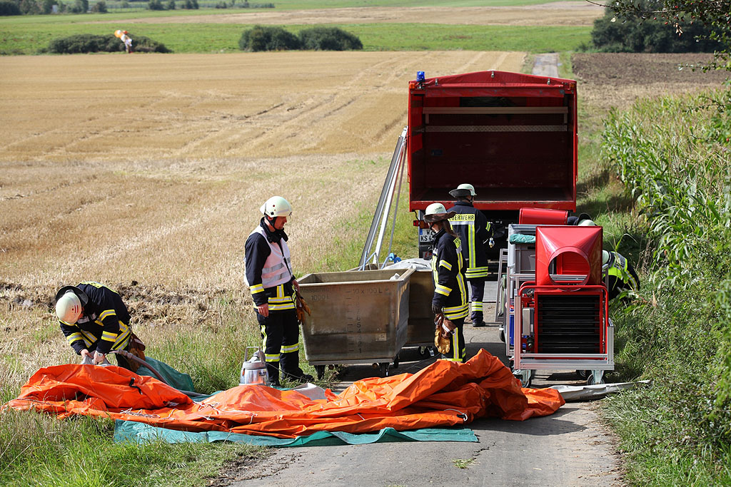 Unter Leitung der Zugführer Daniel Schäfer, Sascha Knaust und Manuel Heiser bewältigten die Feuerwehrleute die Übung in drei Abschnitten systematisch. Zuerst löschten die Feuerwehrleute das brennende Auto unter Atemschutz, befreiten die Insassen mit hydraulischen Rettungsgeräten und dekontaminierten sie. In der Folge wurde der Gefahrstoff mit Auffangbehältern, Bindemitteln und Erdwällen aufgefangen, bevor er mit einer speziellen Pumpe aufgenommen werden konnte. Um den eigentlichen Kern der Arbeiten zur Rettung und Gefahrstoffbekämpfung war eine umfangreiche Infrastruktur notwendig. So wurden beispielsweise Aufenthaltszelte, Dekontaminationsplätze und Gerätebereitstellungsräume aufgebaut. Zu Testzwecken wurde während der Übung auch eine Flugdrohne eingesetzt, sie wurde von der Besatzung des Einsatzleitwagens gesteuert.