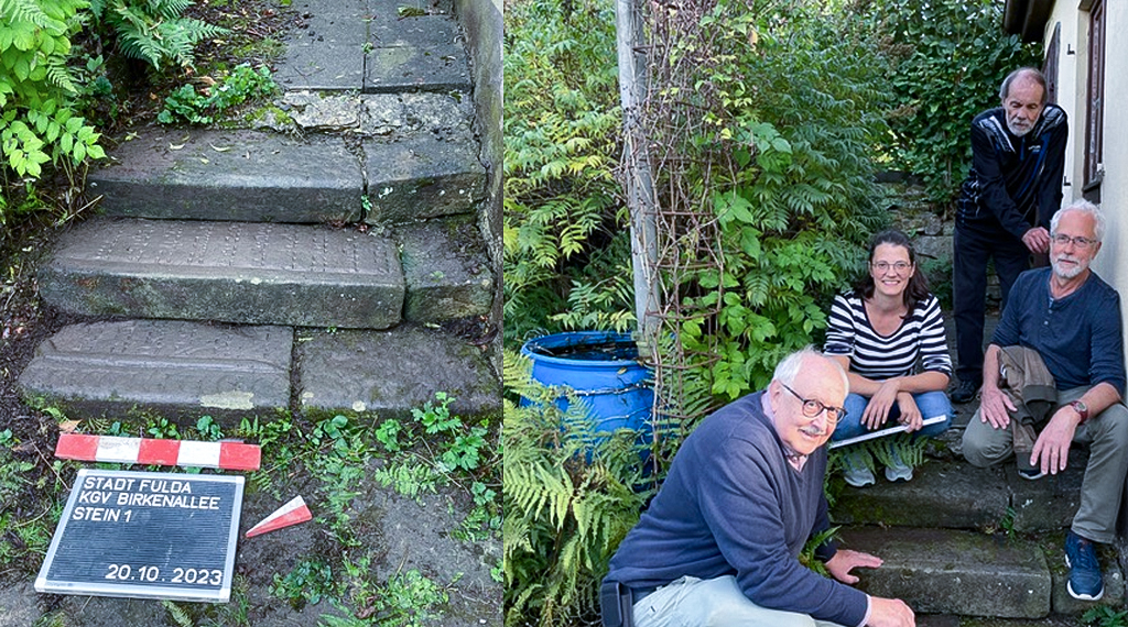 In einer Schrebergartenanlage in Fulda wurden 1946 jüdische Grabsteine als Treppenstufen verbaut. Aus der Familie des damaligen Pächters kam kürzlich der Hinweis auf Treppenstufen mit hebräischen Schriftzeichen. Die Regionalhistoriker Dr. Michael Imhof und Rudolf Zibuschka gingen auf die Suche. Und in der Tat, bei einer Erkundung sind ihnen die bearbeiteten Treppenstufen mit der auffallenden Ornamentik und der hebräischen Beschriftung als mögliche jüdische Grabsteine aufgefallen. Die Freilegung und Reinigung der Steine zusammen mit der Stadt- und Kreisarchäologin Milena Wingenfeld haben die Vermutung bestätigt.