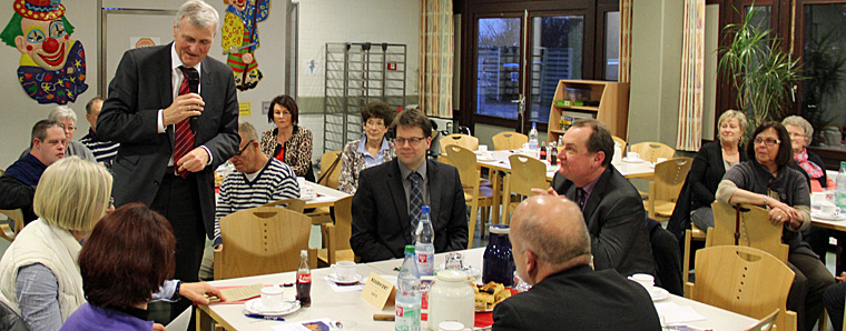 Für die Verbandsleitung sprach Vorstandsmitglied Ansgar Erb, der – wie Bernd Wystrach betonte – der Initiator der zahlreichen VIP-Schichten am Caritas-Stand ist. Erb begrüßte ausdrücklich Oberbürgermeister Möller und den Ersten Kreisbeigeordneten Dr. Wingenfeld stellvertretend für alle VIP-Verkäufer aus Politik und Kirchenleitung, die auch im vergangenen Dezember ihre Schicht am Caritas-Stand mit Bravour geleistet hätten. Seiner Beobachtung nach, so Erb, käme es dank der Anwesenheit und Mitarbeit durch die Prominenz immer wieder zu netten Begegnungen und Gesprächen an der Marktbude.