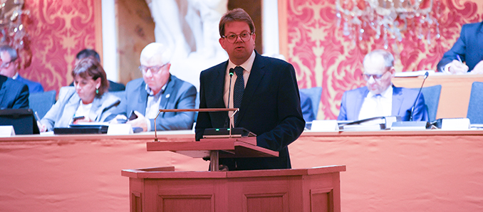 „Die Haushalte stehen vor großen Herausforderungen“, so der Oberbürgermeister. Für den Haushalt einer Stadt sei der Anspruch, nachhaltig zu wirken, keineswegs eine Floskel, sondern von zentraler Bedeutung. „Nachhaltig zu handeln, bedeutet, Rücksicht zu nehmen auf die nachfolgenden Generationen. Das gilt in ökologischer Hinsicht. Das gilt ebenso in finanzieller Hinsicht. Ziel verantwortungsvoller Haushaltspolitik muss es sein, dass auch die nachfolgenden Generationen Gestaltungs- und Handlungsspielräume haben. Diese künftigen Gestaltungsmöglichkeiten können nur dann erhalten bleiben, wenn in den öffentlichen Haushalten die jährlichen Ausgaben zumindest nicht dauerhaft höher sind als die Einnahmen.“ Diese vermeintlich einfache Erkenntnis stelle alle, die für öffentliche Haushalte Verantwortung tragen, derzeit vor große Schwierigkeiten, so Wingenfeld. „Die Rahmenbedingung für die Wirtschaft, deren Produktivität die Basis unseres Wohlstands und unseres Sozialstaats ist, sind deutlich schlechter geworden - und eine Trendwende ist keineswegs erkennbar. Die Sorge vor einer Deindustrialisierung ist kein abstraktes Phänomen, welches irgendwo in Deutschland und Europa stattfindet. Wir erleben diese Deindustrialisierung auch ganz konkret bei uns: Goodyear und Teknos sind nur zwei Unternehmen, die exemplarisch für den Strukturwandel bei uns stehen“, so der OB.