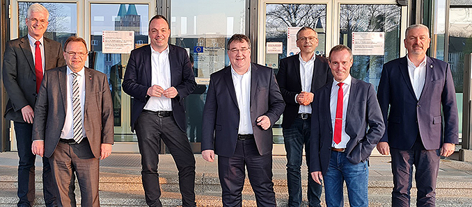 Landrat Torsten Warnecke (Landkreis Hersfeld-Rotenburg), Landrat Winfried Becker (Schwalm-Eder-Kreis), Oberbürgermeister Christian Geselle (Stadt Kassel), Regierungspräsident Mark Weinmeister, Landrat Andreas Siebert (Landkreis Kassel), Landrat Jürgen van der Horst (Landkreis Waldeck-Frankenberg) und Landrat Bernd Woide (Landkreis Fulda). Es fehlten: Landrätin Nicole Rathgeber (Werra-Meißner-Kreis) und Oberbürgermeister Dr. Heiko Wingenfeld (Stadt Fulda). Foto: RP Kassel