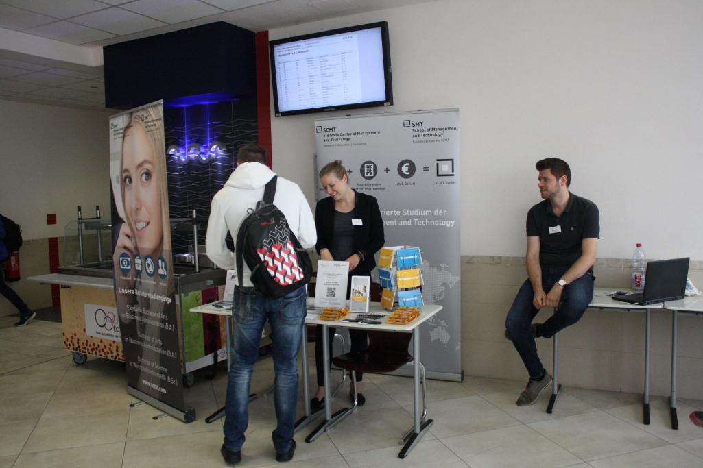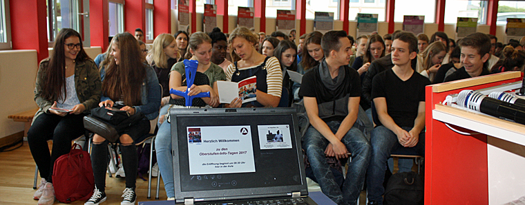 „Mit den Oberstufen-Info-Tagen komprimieren wir das Ausbildungs- und Studienangebot der Region und ermöglichen somit einen guten Überblick mit für Sie überschaubarem Einsatz“, skizzierte Sankewitz die Idee hinter der Veranstaltung. Gerrit Lepper ergänzte, dass es angesichts 10.000 Bachelor-Studiengänge in Deutschland, 1.100 Möglichkeiten des Dualen Studiums und 350 Berufsausbildungen nötig sei, für Übersicht zu sorgen und den jungen Leuten ein umfangreiches, verständliches Bild zu liefern, das ihnen bei der Antwort auf die Frage „Wohin soll die Reise gehen?“ behilflich sein könne. „Wir wollen Entscheidungskompetenz schaffen und haben dafür die Expertise von Menschen aus den verschiedensten Ausbildungs- und Arbeitsumfeldern eingeladen“, führte Lepper aus. Zusätzlich rundeten einige Info-Stände von Universitäten und Anbietern von Freiwilligendiensten die Informationstage ab. Mehr als 60 Referenten und Experten konnte man schließlich im umfangreichen Programm der Oberstufen-Info-Tage zählen. Eine Hebamme berichtete über Ausbildung und Berufsalltag, genauso wie ein Bauingenieur oder Rechtsanwalt. Es gab Einblicke in das Berufsbild der Ökologischen Landwirtschaft oder Hinwiese zu den Einstiegswegen in die Medienbranche. Auch viele verschiedene Duale Studiengänge wurden vorgestellt, darunter nicht nur diejenigen von in der Region ansässigen Firmen, sondern auch die Studiengänge bei Polizei, Zoll oder Bundeswehr. Neben zahlreichen Referenten von verschiedenen Universitäten waren auch Vertreter von Ausbildungsbetrieben der Region vor Ort. Die meisten dieser Betriebe bieten zwar ebenfalls ein Duales Studium an, stellten aber auch ihre Ausbildungsberufe vor.