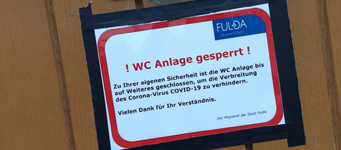 Vielerorts wurden auch öffentliche WC-Anlagen „zur Sicherheit der Bürgerinnen und Bürger“, wie begründet wird, geschlossen. Wir sendeten eine Anfrage an die Pressestelle des Magistrates der Stadt Fulda, warum man hier ebenso verfährt, ist man doch regelrecht dazu gezwungen, seine Notdurft auf öffentlichen Plätzen zu verrichten. Von Seiten der Magistratspressestelle antwortete man uns: „Die Schließung der Toilettenanlagen erfolgte auf dringende Empfehlung des Gesundheitsamtes. Da wir sowieso die meisten Geschäfte und alle Gastronomiebetriebe geschlossen haben, so gut wie keine Touristen unterwegs sind und die Publikumsfrequenz insgesamt sehr niedrig ist, hat sich die Stadt zu einem solchen Schritt entschieden. Die WC-Anlagen werden in Abstimmung mit dem Gesundheitsamt wieder geöffnet werden, sobald es die Situation erlaubt.“ +++