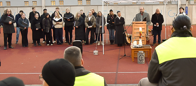 Fast alle Inhaftierten waren zum Gottesdienst in den Freizeithof der Anstalt gekommen. Dort wurden sie von Anstaltsleiter Karsten Koudela begrüßt. Er hieß zudem zahlreiche Gäste willkommen, darunter Imam Lhcen Essiaghi, Prälat Christof Steinert, Caritas-Geschäftsführerin Susanne Saradj, Schwester Karin Maria Stenger SMS, den Musiker Thilo Zschorn, Gerhard Röchow und Dr. Norbert Höhl von den Gideon, den Vorsitzenden des Anstaltsbeirats Winfried Möller sowie Manuela Langstein und Juliane Kulgemeyer von der Deutschen Pfadfinderschaft Sankt Georg (DPSG). Ebenfalls anwesend waren Domkapellmeister Franz-Peter Huber und Mitglieder des Jugendkathedralchores.