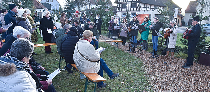 Zum „Offenen Singen“ am Rasdorfer Adventsweg, das zum zweiten Mal angeboten wurde, hatten sich ca. 100 Menschen aller Altersstufen eingefunden. Die adventlichen Lieder, die Elfriede Möller zusammengestellt hatte, wurden von Theo Lenz in ein Liedheft gefasst. Er hatte auch für die Technik und Sitzgelegenheiten gesorgt. Die musikalische Begleitung unter Leitung von Elfriede Möller hatten Bernd Wald (Akkordeon), Tabea Gollbach (Querflöte und Gitarre), Christina Weber, Edith Wiegand und Elfriede Möller, (alle Gitarre) übernommen. Es erklangen Lieder wie „Wir sagen euch an den lieben Advent; Es ist für uns eine Zeit angekommen; Morgen Kinder wird´s was geben; Fröhliche Weihnacht überall“. Als Canon wurde „Mache dich auf und werde Licht“ gesungen. Zum Mitschunkeln kam der Schneewalzer zum Einsatz, der auch als Zugabe gefordert wurde. Nele Fladung und Mariann Bohlen trugen zwei Weihnachtgeschichten vor. Am Ende der Veranstaltung gab es selbstgebackene Waffeln sowie heißen Tee, die ebenso Nele Fladung und Mariann Bohlen anboten. Beides fand reißenden Absatz. +++ wim