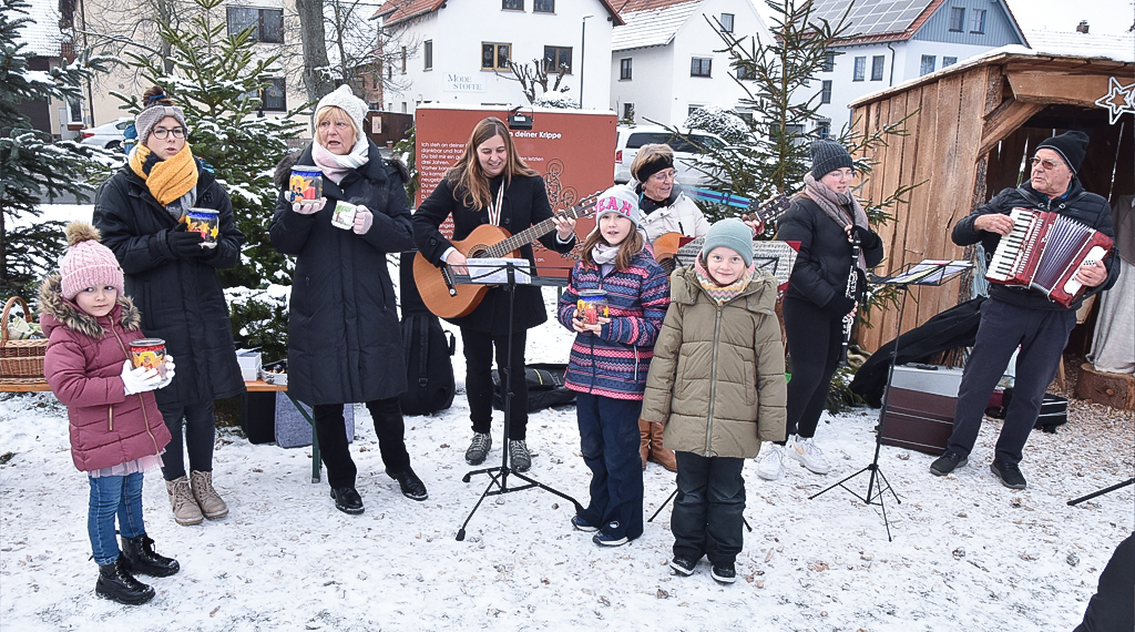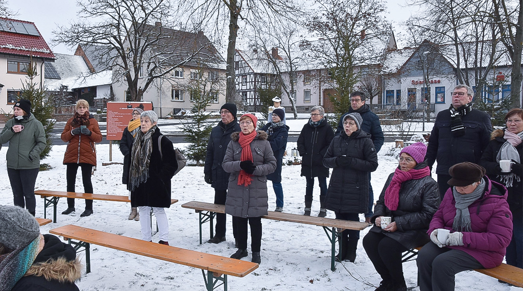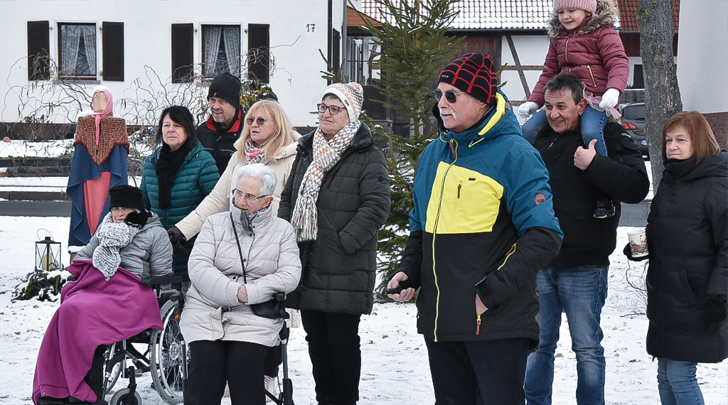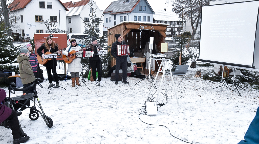 Zu einem „Offenen Singen“ hatte die Pfarrgemeinde zum Rasdorfer Adventsweg eingeladen. Trotz sehr frostiger Temperaturen hatten viele das Angebot im Freien angenommen. Die adventlichen Lieder wurden auf eine Leinwand von Theo Lenz mit einem Beamer angezeigt, so dass alle Anwesenden mitsingen konnten.. Begleitet wurden die Lieder musikalisch von Bernd Wald, Akkordeon, Charleen Herget, Klarinette, Christina Weber und Elfriede Möller, beide Gitarre. Bei „Wir sagen euch an den lieben Advent“ wurden zu jeder Strophe eine Kerze im Glas entzündet. Weiter Lieder waren beispielsweise: „Im Advent ist ein Licht erwacht; Es ist für uns eine Zeit angekommen; Morgen Kinder wird’s was geben; Alle Jahre wieder oder Fröhliche Weihnacht“. Zwei Kinder trugen ein Gedicht vor und eine Weihnachtsgeschichte verfasst von Joachim Salmann wurde vorgelesen. Die Mitsingenden waren begeistert und wünschen eine Wiederholung im nächsten Jahr. +++ wim