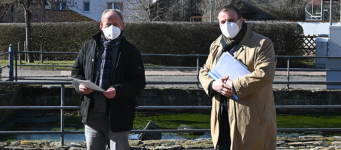 Die Planung ist fertig, der Bewilligungsbescheid ist da: Bürgermeister Benjamin Tschesnok und Ortsvorsteher Hermann Weber freuten sich, dass in den nächsten Wochen mit Umgestaltung des Dorfplatzes in Rudolphshan begonnen werden kann. In einem weiteren Schritt soll auch das Backhaus saniert werden. Foto: Helmut Käsmann