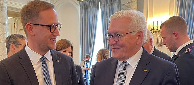Am Freitag folgte Bürgermeister Leopold Bach einer persönlichen Einladung des Bundespräsidenten Frank-Walter Steinmeier ins Schloss Bellevue. Corona-Pandemie, Klimawandel - und nun auch noch der Krieg in der Ukraine – einerseits scheint es, dass die Kommunen gar nicht mehr aus dem Krisenmodus herauskommen, andererseits zeigt aktuell der Krieg in der Ukraine mit der größten Fluchtbewegung in Europa seit Ende des Zweiten Weltkriegs: Die Hilfsbereitschaft der Menschen ist groß, das Land rückt zusammen. Diese beiden Pole beschrieb Bundespräsident Frank-Walter Steinmeier zum Auftakt seiner Besuchsreihe „Ortszeit Deutschland“. Über das „Zusammenhalten in Krisenzeiten“, „Beispiele aus der aktuellen Flüchtlingshilfe“ sowie „Perspektiven nach der Pandemie“ sprachen die Vertreter der Kommunen und der Zivilgesellschaft mit dem Staatsoberhaupt zunächst in seinem Amtssitz Schloss Bellevue. Stark vertreten war das Netzwerk Junge Bürgermeister, darunter auch der Bürgermeister der Gemeinde Feldatal, Leopold Bach.