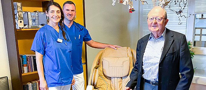 Seit einigen Tagen bietet die Helios St. Elisabeth Klinik Hünfeld ihren Palliativpatienten und deren Angehörige die Möglichkeit zu einer besonderen Auszeit. Im Aufenthaltsraum der Palliativstation des Krankenhauses steht diesen nun ein Massagesessel zur Verfügung. Den Sessel konnte die Klinik dank einer großzügigen Spende des Palliativfördervereins Hand in Hand Hünfeld kaufen. In dem Sessel können Patienten und Angehörige verschiedene Massageprogramme genießen. Von Kopf bis Fuß, von sanft bis intensiv. Während der nun kälteren Monate besonders angenehm: Der Sessel ist mit einer Wärmefunktion ausgestattet. Die Spende hatte Dr. Ambros Greiner dem Hünfelder Krankenhaus überreicht. Greiner ist Gründer und 2. Vorsitzender des Vereins. In der Vergangenheit hat er in der Helios St. Elisabeth Klinik gearbeitet, unter anderem als Leiter der Palliativstation.