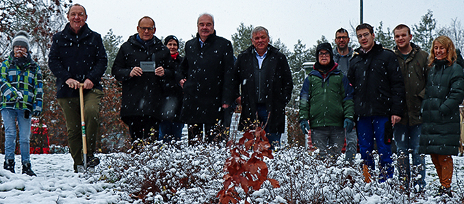 Bürgermeister Dag Wehner kam zur Caritas Eingliederungshilfe in die Ratgarstraße, wo „seine“ Blutbuche ihren Platz direkt neben dem Caritas-Haus St. Elisabeth gefunden hat. Mit der Caritas-Verbandspitze waren auch Vertreter und Vertreterinnen des Bereichs Wohnen sowie eine Gruppe aus dem Berufsbildungsbereich mit dabei. Der Politiker lobte ausdrücklich die enge Zusammenarbeit der Caritas im Bistum Fulda mit der Stadt Fulda in sozialpolitischen Fragen und nannte seine übernommene Baumpatenschaft ein sichtbares Symbol für diese gute Kooperation.