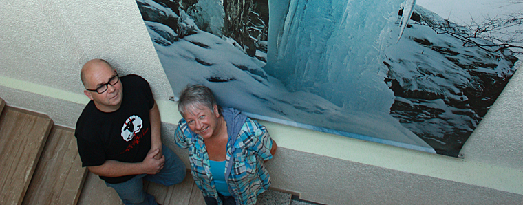 Die Pension der Eltern hat er in den vergangenen vier Jahren gemeinsam mit seiner Frau Silvia – größtenteils eigenhändig – renoviert. Ansprechend ist nicht nur die Verbindung mo-derner mit nostalgischen Elementen in den zehn Zimmern, dem Aufenthalts- und dem Empfangsraum; ihm schwebt vor, das Gebäude zu einer „Leinwand“ für die Rhön zu machen. Stolz zeigt er seine „Rhöngalerie“: großformatige Bilder des Eckweisbacher Fotografen Christian Reinhardt, auf denen atemberaubend schöne Naturmomente festgehalten sind. So wird der Gang durch das Treppenhaus zu einer Mini-Wanderung entlang einer originalgroßen Eis-Kaskade an der Milseburg und der Prismen-Wand am Gangolfsberg.