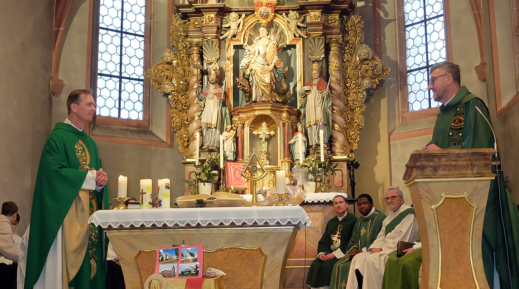 Er sei froh und dankbar, dass so viele Menschen gekommen seien und er würde gerne jeden einzelnen mit Namen begrüßen, was aber den zeitlichen Rahmen sprengen würde. In seiner Predigt hielt er Rückschau auf seine 15 Wirkungsjahre in der Pfarrei mit den vielen Dörfern, Höfen und Mühlen. Drei Dinge habe er mitgebracht, die ihn an diese Zeit besonders erinnerten. Die Stola stehe für Gott, Segensfeiern, Freizeiten, sowie die Buntheit, den Wert und die Vielfalt der Gottesdienste, Wallfahrten und Patronatsfeste mit den eingebrachten wertvollen vom Glauben geprägten Text. Das kleine Bündel Brief, das er in der Auszeit nochmals studiert habe, beinhalteten Enttäuschung, Belastung aber auch Freundschaft, die er im Herzen mitnehme. Sie machten ihn dankbar für Begleitung, Gebete, guten Wünsche und Begegnungen unterschiedlicher Art. Als drittes hatte Pfarrer Andreas Matthäi einen Schlüssel mitgebracht. Er symbolisiere das neu gebaute Pfarrheim. Es brauche Räume, um Gemeinschaft feiern zu können. Eine Gemeinschaft, die zusammenführte und in die Zukunft weise. Nur so könne der Leib, der aus vielen Gliedern bestehe zum Leib Christi werden. Besondern Dank sagte er den vielen Unterstützenden beim Bau des Pfarrheims und besonders Bernhard Schindler, der die Bauleitung übernommen hatte. Die erlebte Faszination während seiner 15-jährigen Tätigkeit nehme er als Erfahrung mit. Aber ein Teil seines Lebens lass er auch da. Er wünschte der Gemeinde ein gutes Aufbrechen in eine neue Zeit und Zukunft. Die Anwesenden dankten Pfarrer Andreas Matthäi mit langem Applaus für seine Abschiedspredigt. Den Dank der pfarreilichen Gremien überbrachte Ute Götz. Sie bezeichnete den scheidenden Pfarrer als einen guten Hin- und Zuhörer, dessen Wirken nachhaltig sei. Man werde ihn vermissen, wenn er jetzt nach Eiterfeld ins hessische Kegelspiel wechseln würde, wo wer bereits als Kaplan gewirkt habe.
