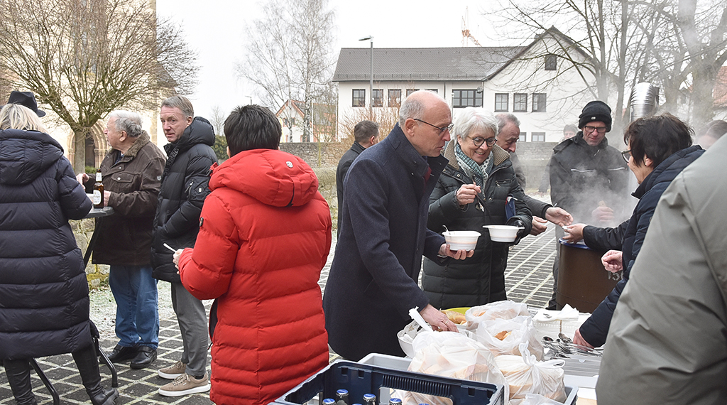 In seiner Predigt betonte er, wie wichtig es sei, gemeinsam im Glauben verbunden zu bleiben. Er stellte die Frage, was eine Familie zusammenhalte. Familie zeige sich darin, Eins zu sein, auch wenn man sich nicht immer verstehe oder einig sei. Wichtig sei es, in der Familie über Gott zu sprechen, gemeinsam Gottesdienste zu besuchen, zu beten und Respekt vor Unterschiedlichkeiten zu haben sowie ein echtes Vorbild zu sein. Den Gottesdienst gestalteten die Messdienerinnen und Messdiener sowie das FamGo-Team musikalisch mit einem eigens gedichteten Lied. An der Orgel und mit zwei Trompetenstücken war Georg Hahner aus Leimbach zu hören. Nach dem Gottesdienst konnten sich die Gemeindemitglieder bei Gulaschsuppe und Getränken persönlich von Pfarrer Ulrich Piesche verabschieden. +++ wim