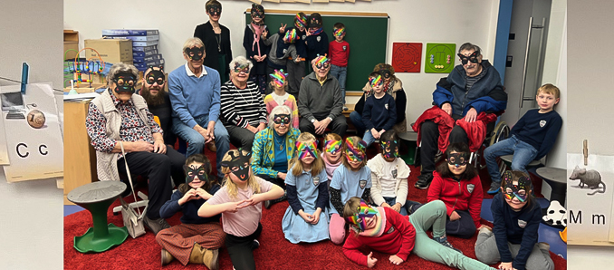 Vor kurzem trafen sich wieder sechs Bewohner aus dem Mediana Wohnstift mit 22 Kindern der Reception Class. Die Lehrerin Tatjana Höck hatte als Thema Fasching ausgewählt; bei lauter Karnevalsmusik entstanden bunte Masken. In jedem Monat findet so ein Treffen statt - manchmal auch direkt im Mediana Wohnstift. Marcus Schrödter, der im Mediana Wohnstift in der Fuldaer Friedensstraße die soziale Betreuung leitet, freut sich mit Schulleiterin Wiebke Warncke über den Erfolg: "Unsere Bewohner fragen ständig nach, wer mitkommen darf." Auch die Kinder können es kaum erwarten - Wiebke Warncke erzählt schmunzelnd: "Wir losen aus, wer neben wem sitzen darf." Im Mittelpunkt steht immer noch, Alt und Jung zusammenzubringen; so können neue Freundschaften entstehen. Die Bewohner vom Wohnstift dürfen auch zu den großen Schulversammlungen kommen, den sogenannten "assemblies", wo alle Schüler der Privaten Grundschule dabei sind.